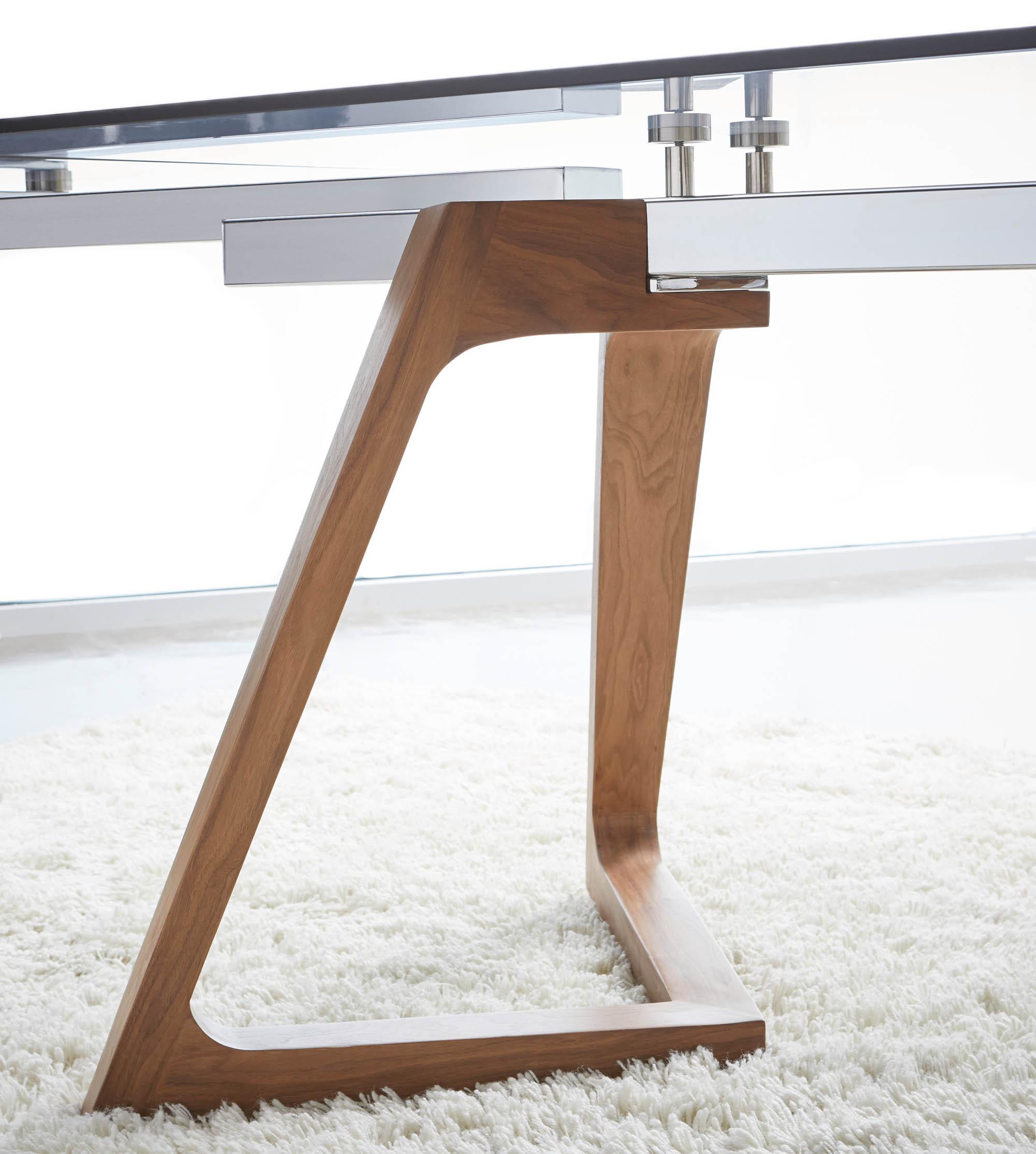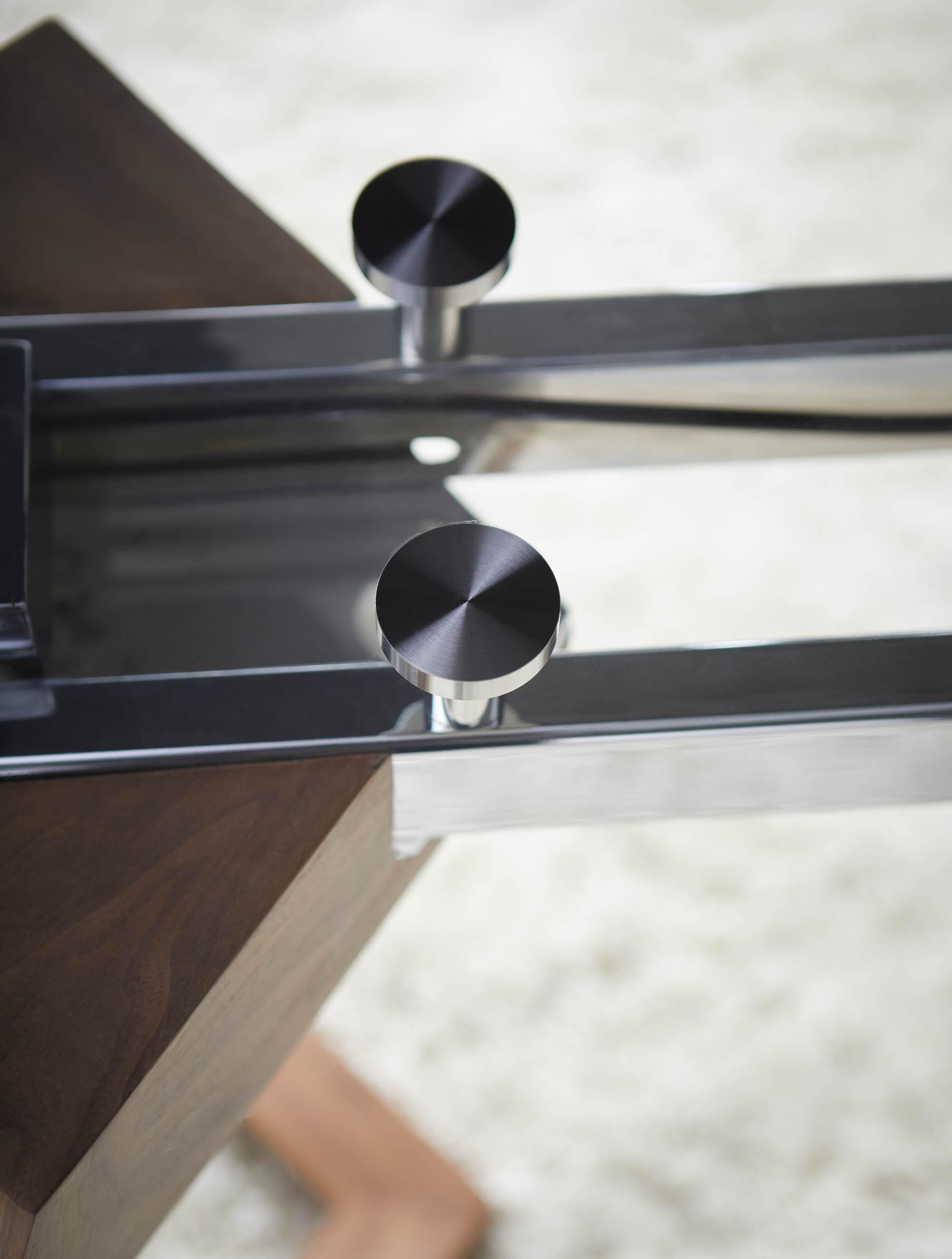 - Materials: Solid Walnut Wood, Walnut Veneer, Chromed A3 Steel, Tempered Glass
