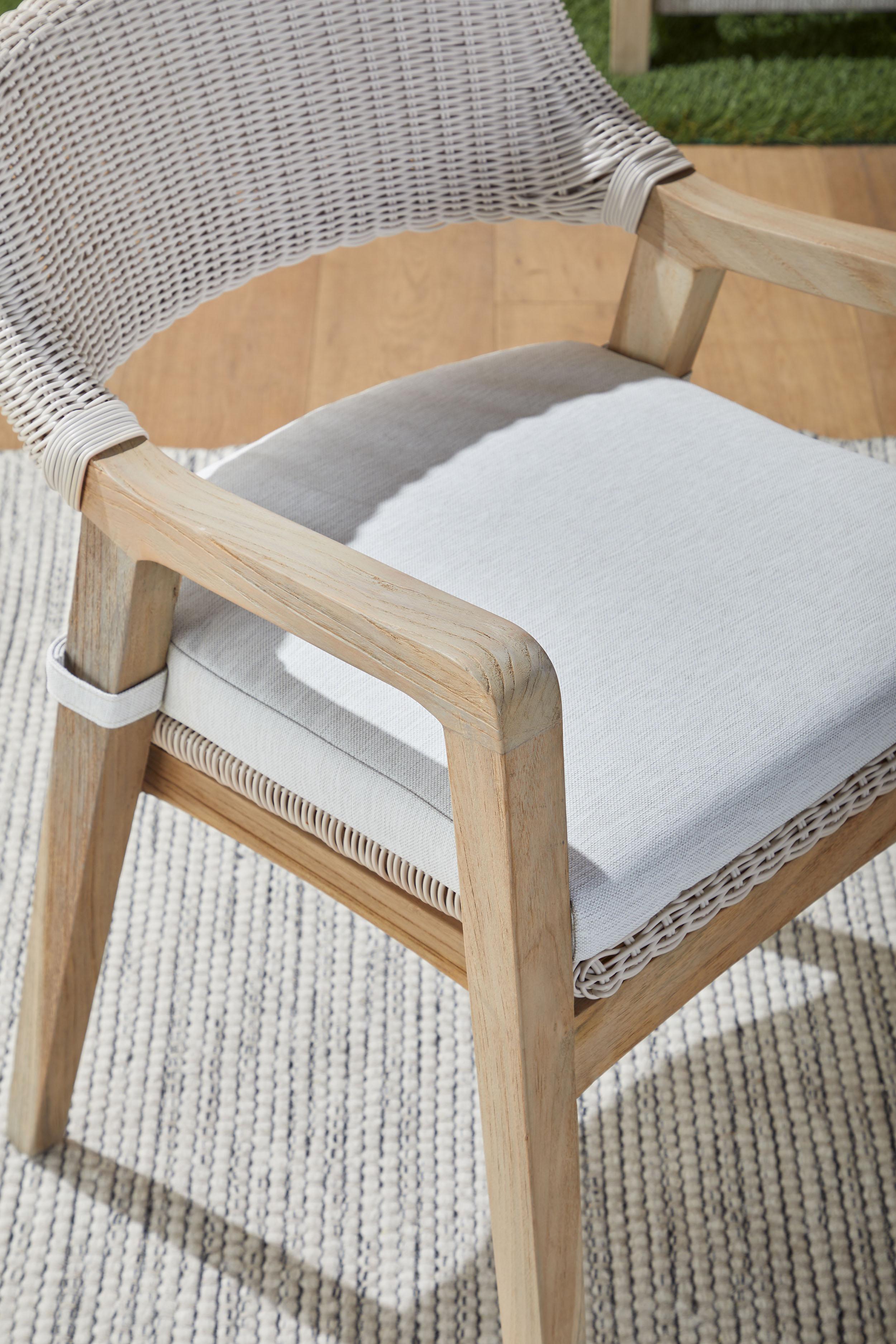 - Materials: Solid Teak Wood, Synthetic Wicker, Aluminum, 100% Olefin Fabric, Foam