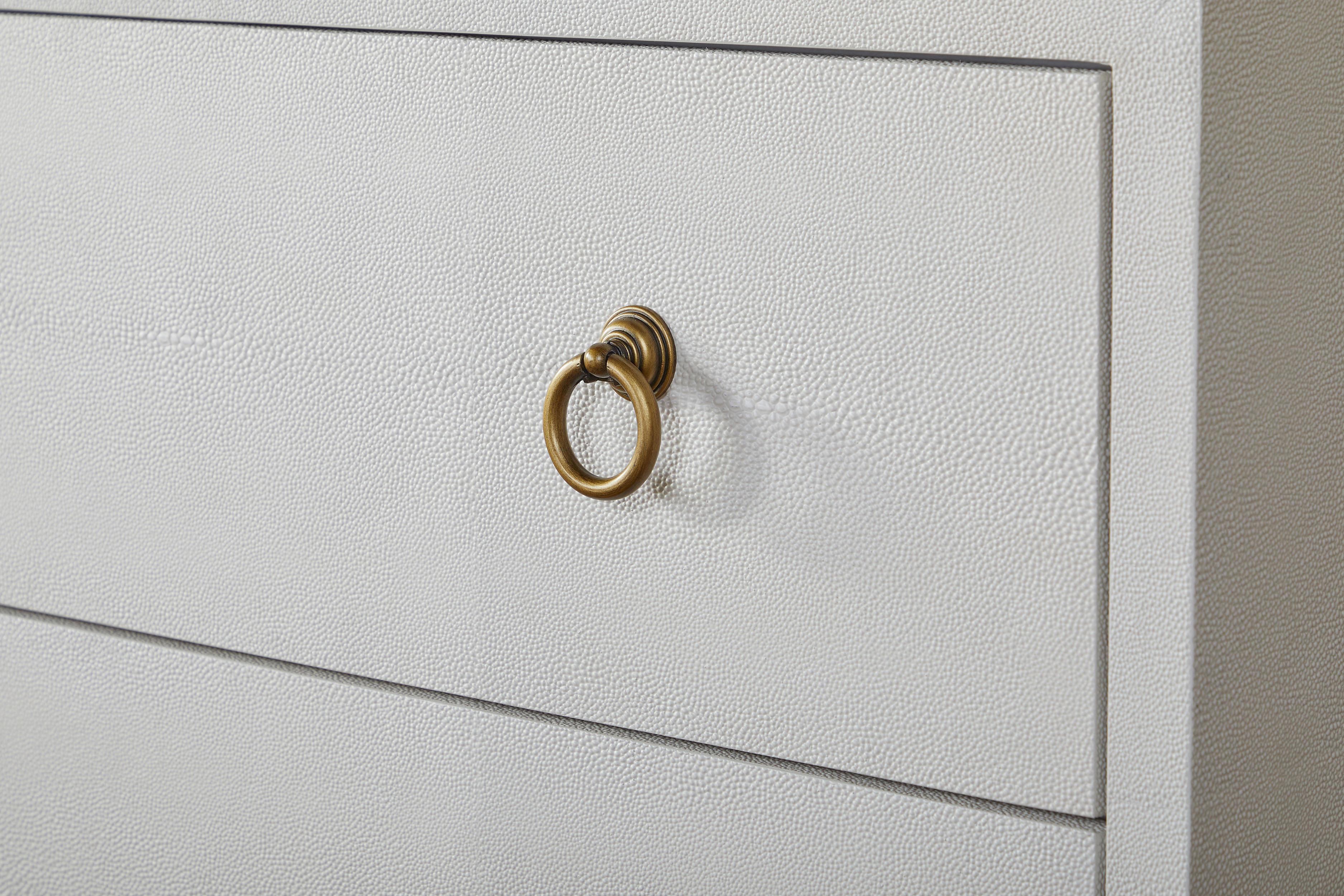 Tradition Collection's Faux Shagreen finish is meant for indoor use only. This material is created by pouring a liquid resin mixture into a mold to recreate the look and feel of real Stingray skin. This process produces an unavoidable variance in both color and texture. The mold used creates panels which are then adhered to each piece of furniture resulting in the characteristic seaming. Because this is done by hand, varying degrees of seam visibility are to be expected. By ordering products from this collection, you accept the natural characteristics unique to each item and agree that no claims will be approved regarding these natural variations. Special care should be taken to protect this finish.